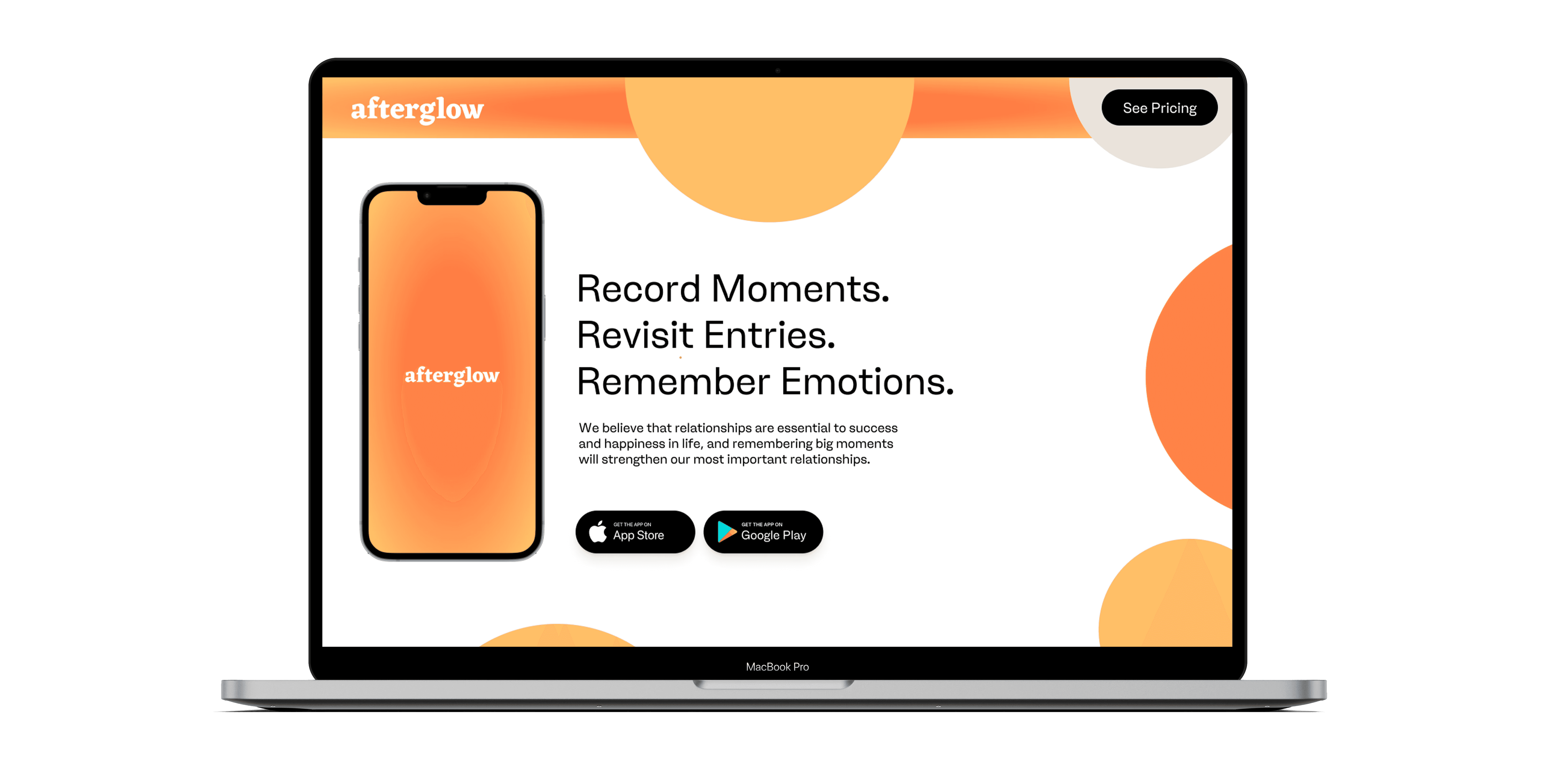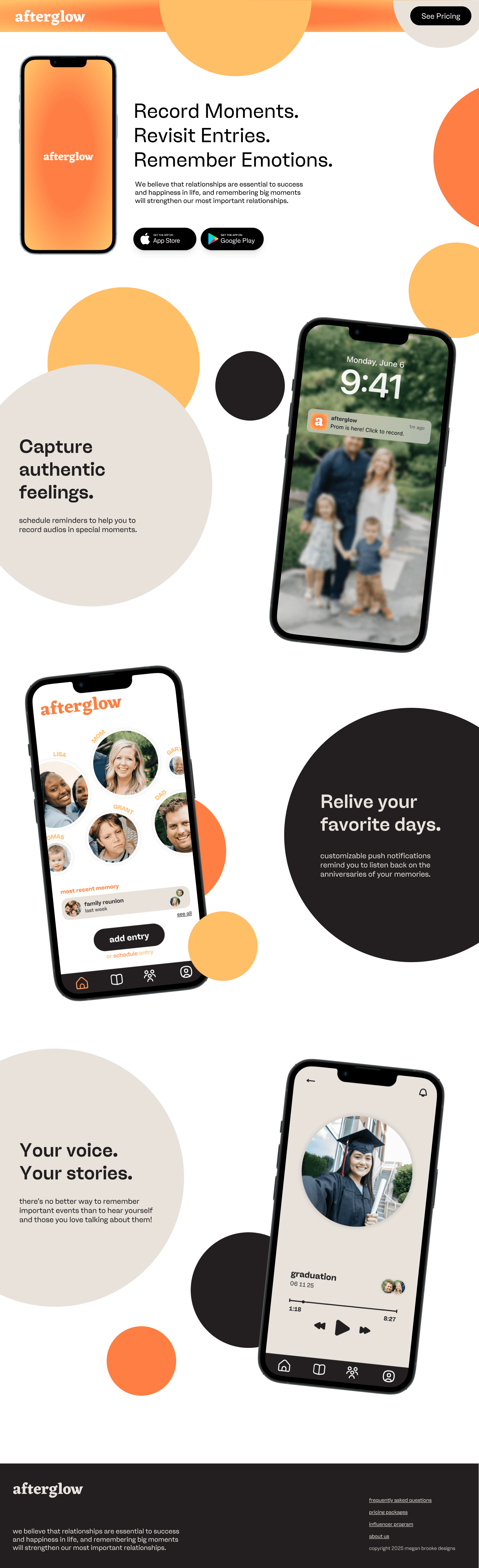 Afterglow is a voice-based journaling app based on relationships, designed based on user research and feedback. Users record memories in the moment and the people they are with can be tagged. The app also prompts users to set reminders to take them back to their memories and remember the times they were with those they loved.