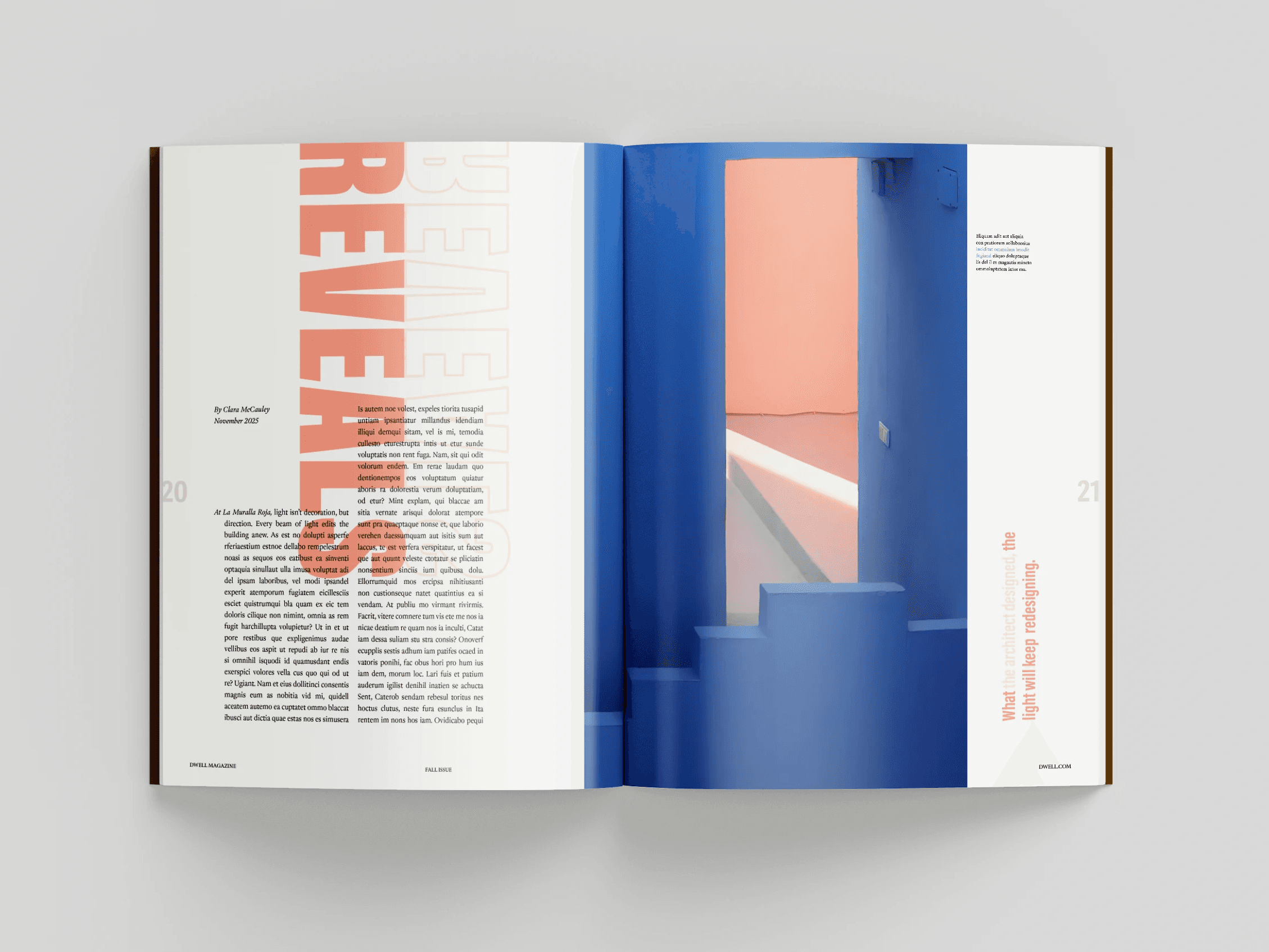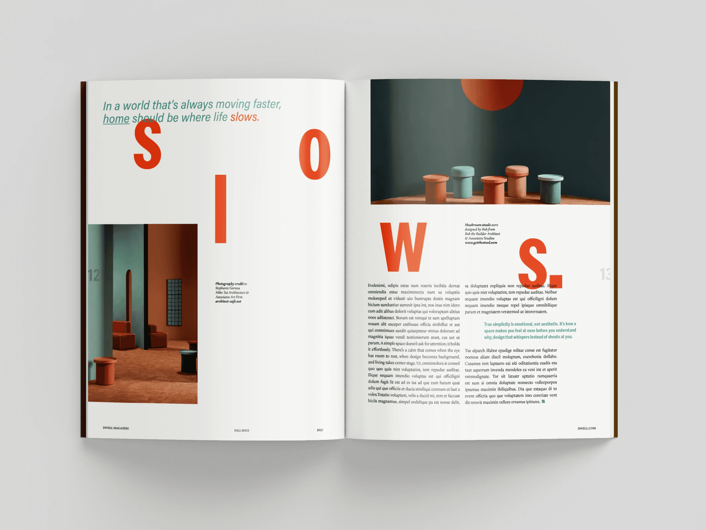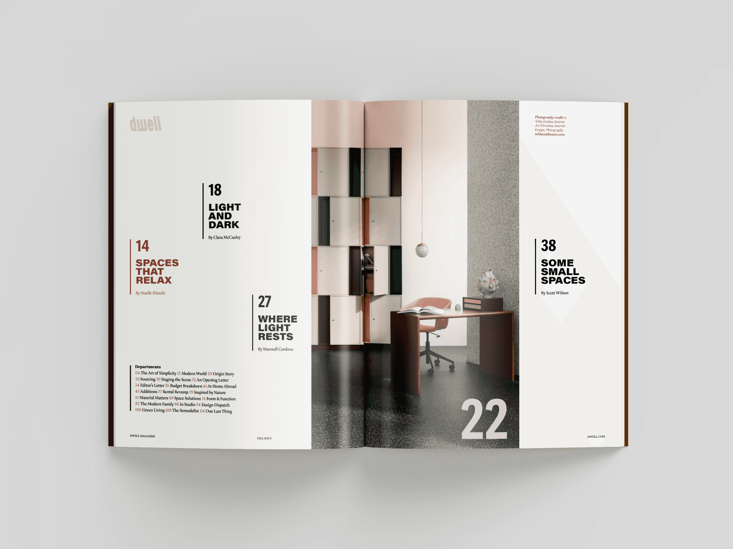 This redesign of Dwell magazine focused on interiors: cozy and colorful interior photography and a new masthead inspired by light streaking through a window and into a room.