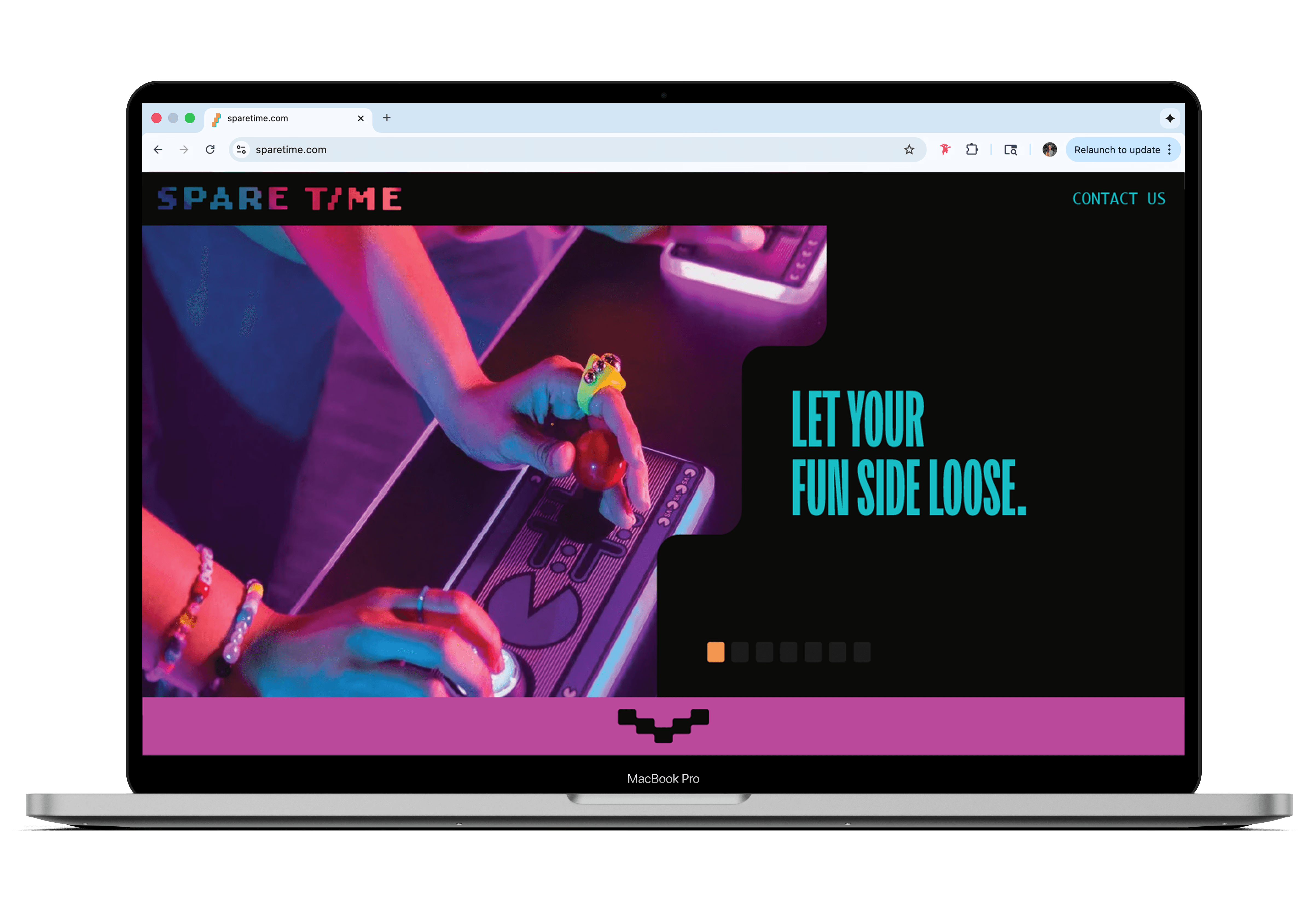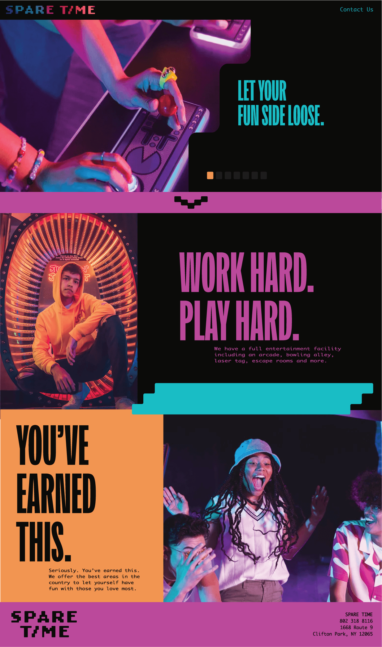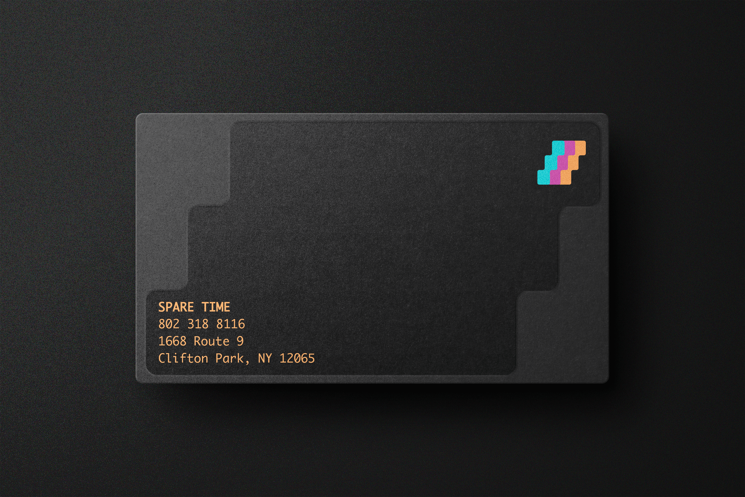 Spare Time is an entertainment center in Clifton Park, New York. It started as a bowling alley in 1968. Using the slash mark of a "spare" in bowling, this rebrand nods to the entertainment center’s heritage while securing its spot in an atmospheric experience market.