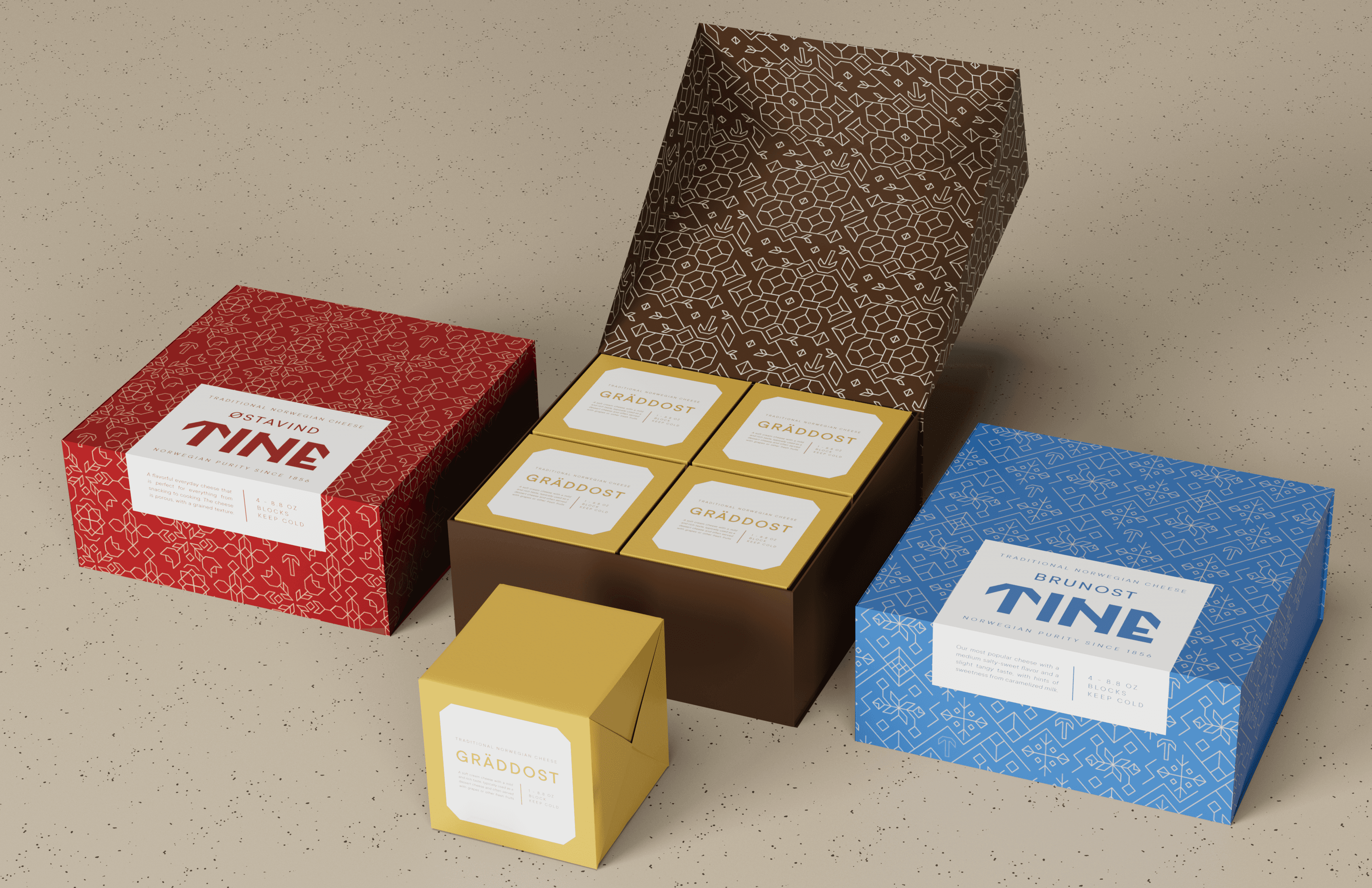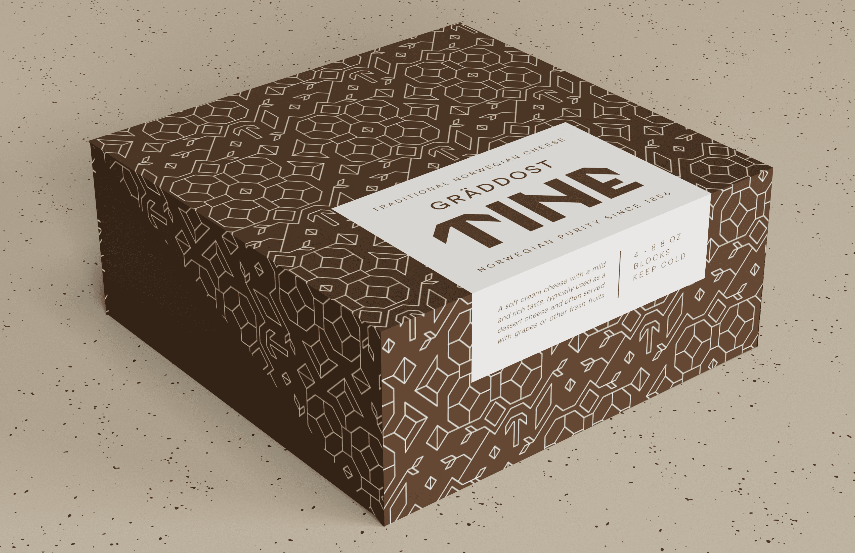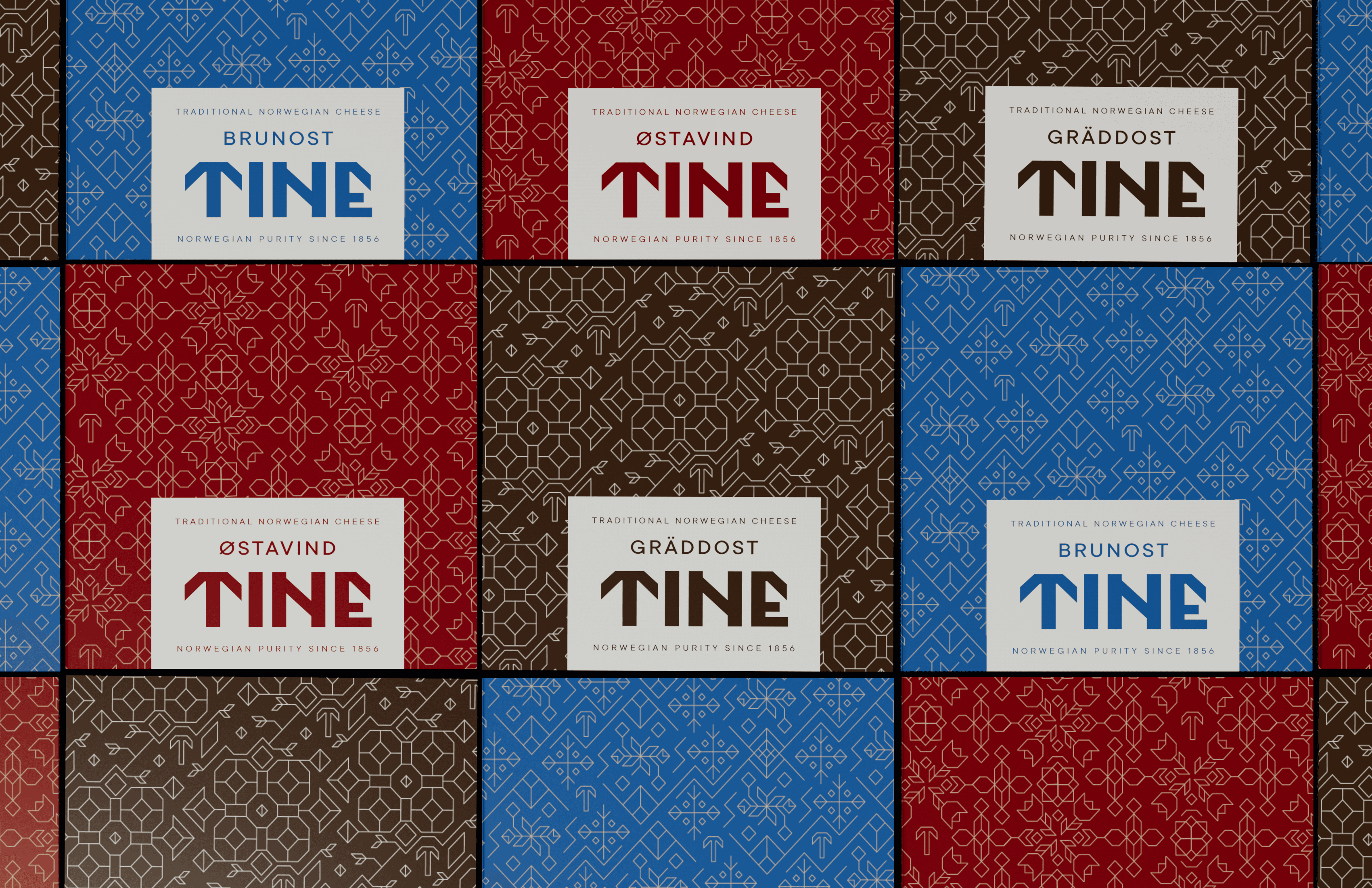 Tine is a Norwegian cheese company named for a wooden box that would traditionally store cheese. Tine boxes were often decorated with floral patterns. This rebrand elevates the company with a design that nods to its roots and is modern and classy. Both the custom logotype and the custom patterns are built on a strict grid.